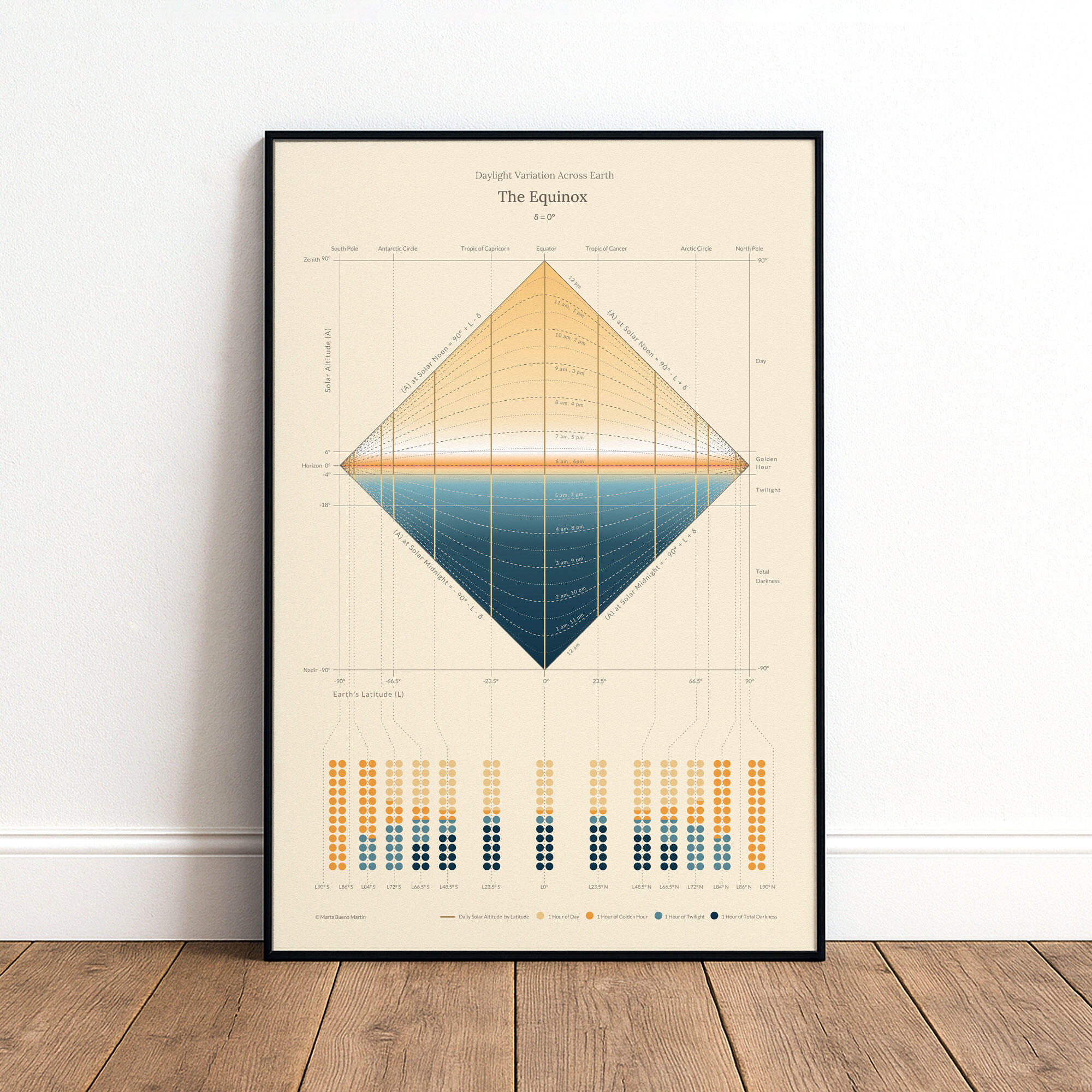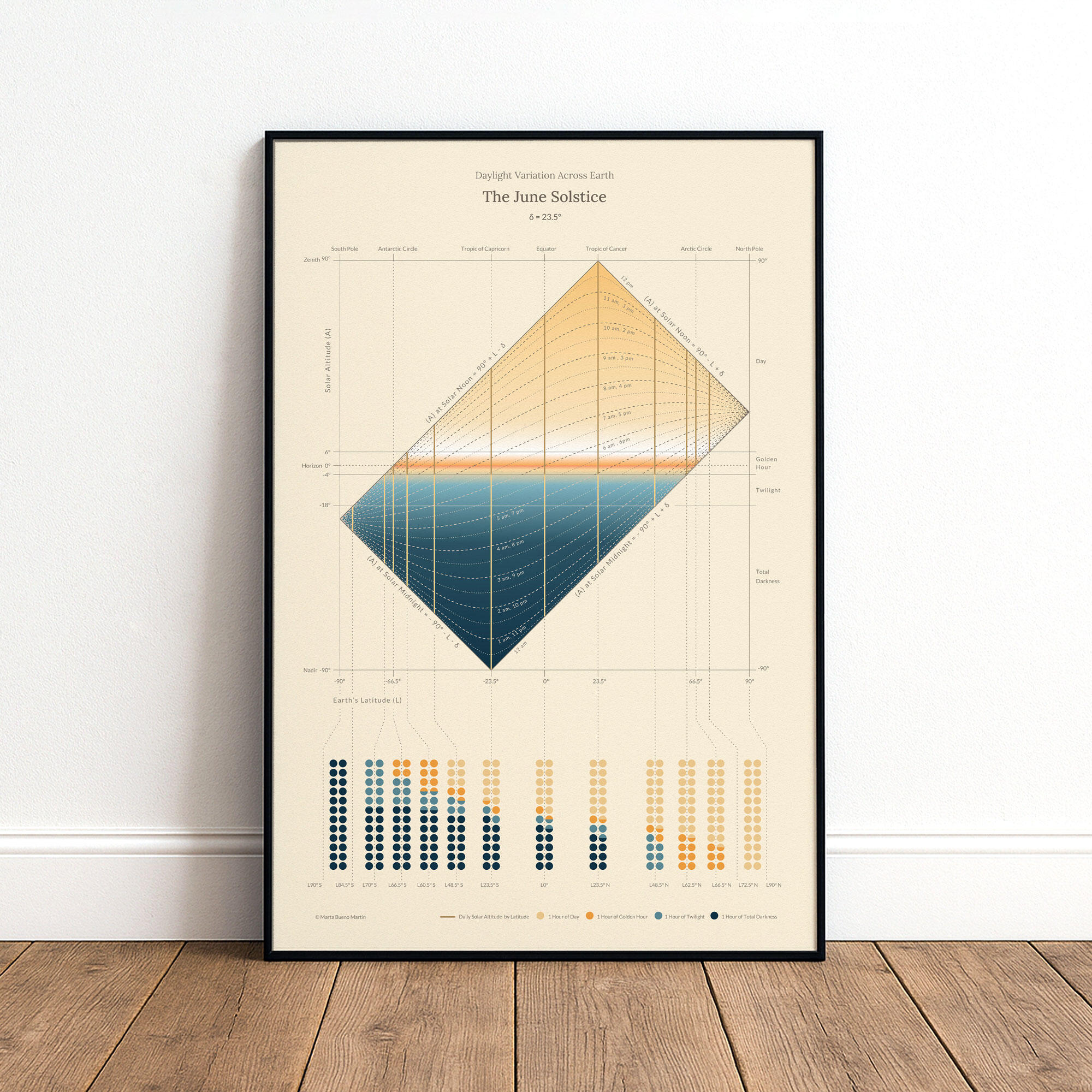 Daylight Variation Across Earth is a series of solar geometry diagrams that map the Sun’s hourly altitude across every latitude for a specific day—translating complex astronomical data into a single, readable image.Each diagram reveals how daylight, golden hour, twilight, and darkness shift across latitudes and throughout the year—from the extreme seasonal swings at the poles to the near-constant balance of day and night at the equator.They also highlight which regions experience the longest golden hour and twilight—valuable insight for photographers and anyone seeking the perfect light.